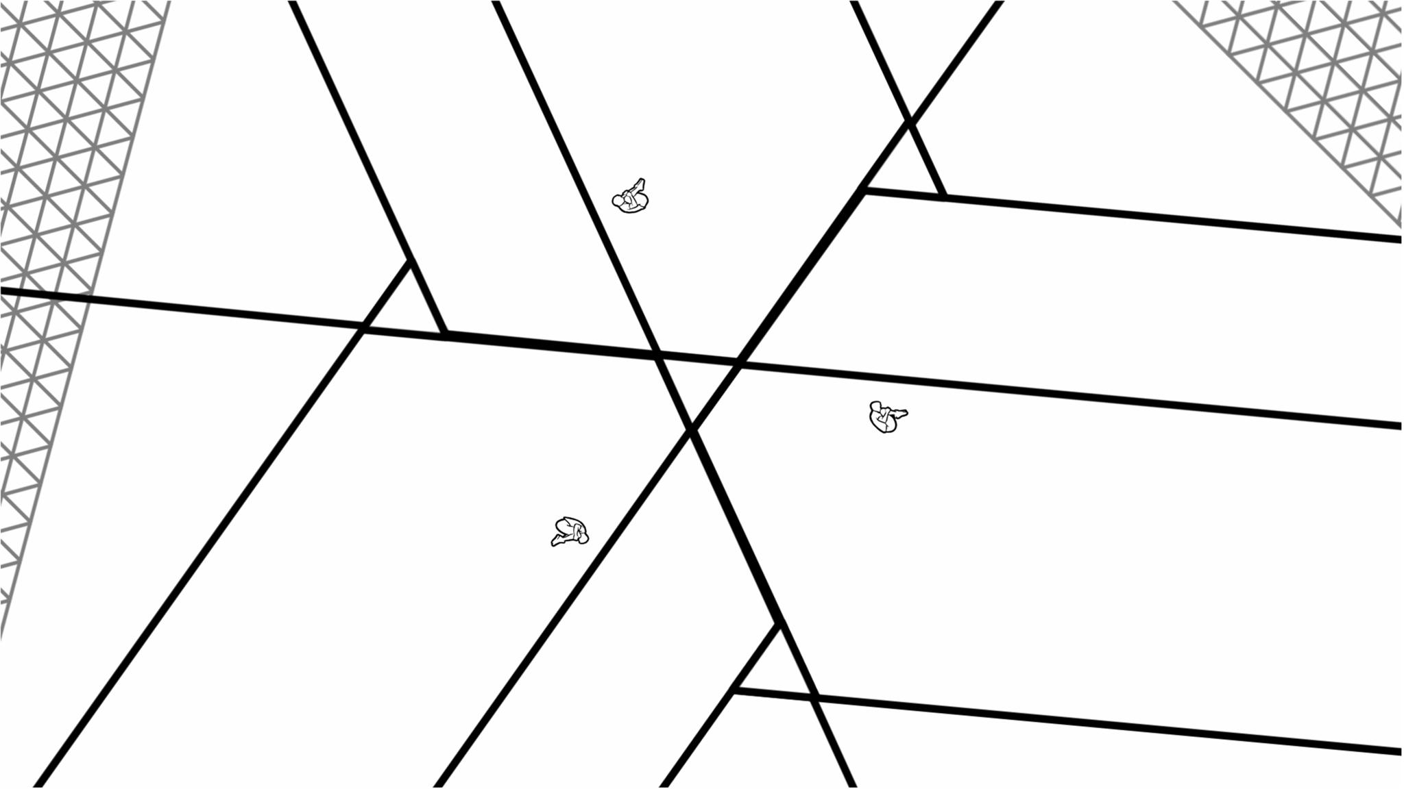 Véritable expérience visuelle et auditive, ce court métrage d’animation expérimental de Renaud Hallée nous fait basculer dans un immense mécanisme aux rouages captivants, où les notions de ce qui est à l’endroit et à l’envers n’existent plus. Dans cette architecture rigoureuse entièrement composée de lignes et de triangles évoluent des dizaines de minuscules trampolinistes qui, au fil de leurs déplacements et de leurs rebonds, déclenchent des engrenages narratifs et musicaux. Une œuvre d’art ludique, où le son et l’image ne font qu’un.
